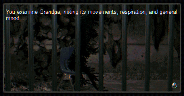 Ini benar-benar permainan hewan peliharaan virtual. Seminggu sekali, Anda mengunjungi kakek di ruang bawah tanah untuk merawatnya. Anda harus membersihkan semua kotoran yang tampak muncul di sekitarnya, mengungkap dokumen, barang, dan makanan baru. Anda dapat memberinya makan semua yang dibutuhkan kakek untuk tumbuh kuat dan sehat: kacang mete basi, pisang coklat, insulasi fiberglass, makanan kakek yang biasa. Dan tentunya Anda bahkan dapat berbicara dengan kakek tersayang Anda, begitu mulutnya sudah besar. Menemukan catatan penelitian memungkinkan Anda mengajarinya kata-kata baru melalui minigame dengan visualisasi yang tidak menyenangkan dari jaringan lunak tenggorokan yang mengepak. Anda kemudian dapat berbicara dengan kakek tentang topik ini dan oh, cerita apa yang dia punya!